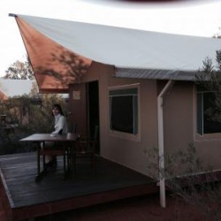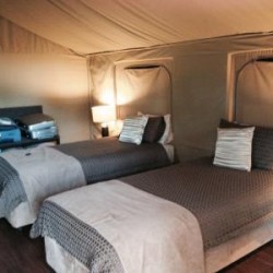 On a passé la nuit dans un lodge très luxueux : Tente avec une salle de bains avec une douche italienne, une terrasse, un chauffage, de très beaux lits, des lampes,...