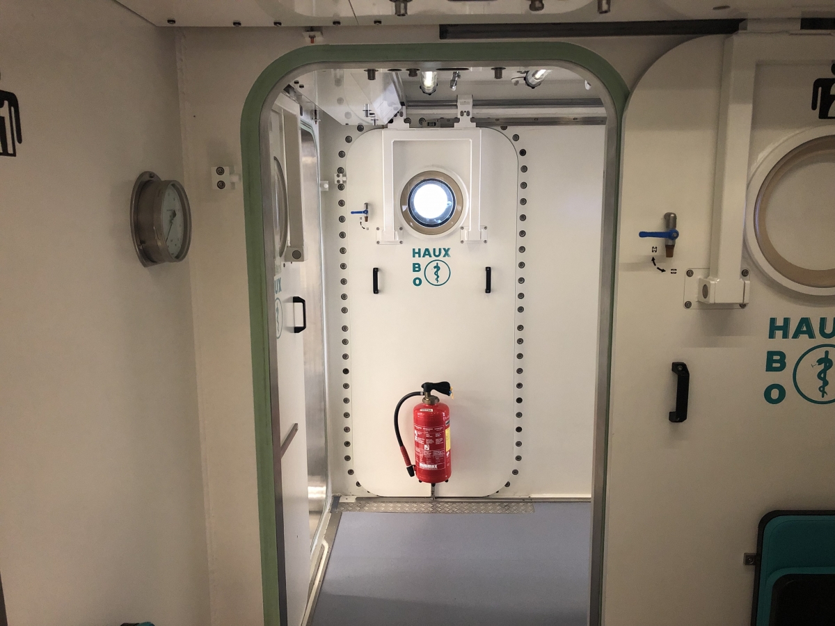 Nous plongeons donc à 40 mètres mais à sec... et ça change tout. A la descente il fait chaud, à la remontée il fait froid, l’équilibrage des oreilles est différent, et l’euphorie de la narcose s’entend bien 😂 Sous l’eau on ne peut pas parler mais là ce n’est pas pareil, on nous entend bien. Nous avons tous une voix de canard à partir de 30 mètres (il y a une déformation des cordes vocales à cette profondeur) et forcément ça part dans des délires.