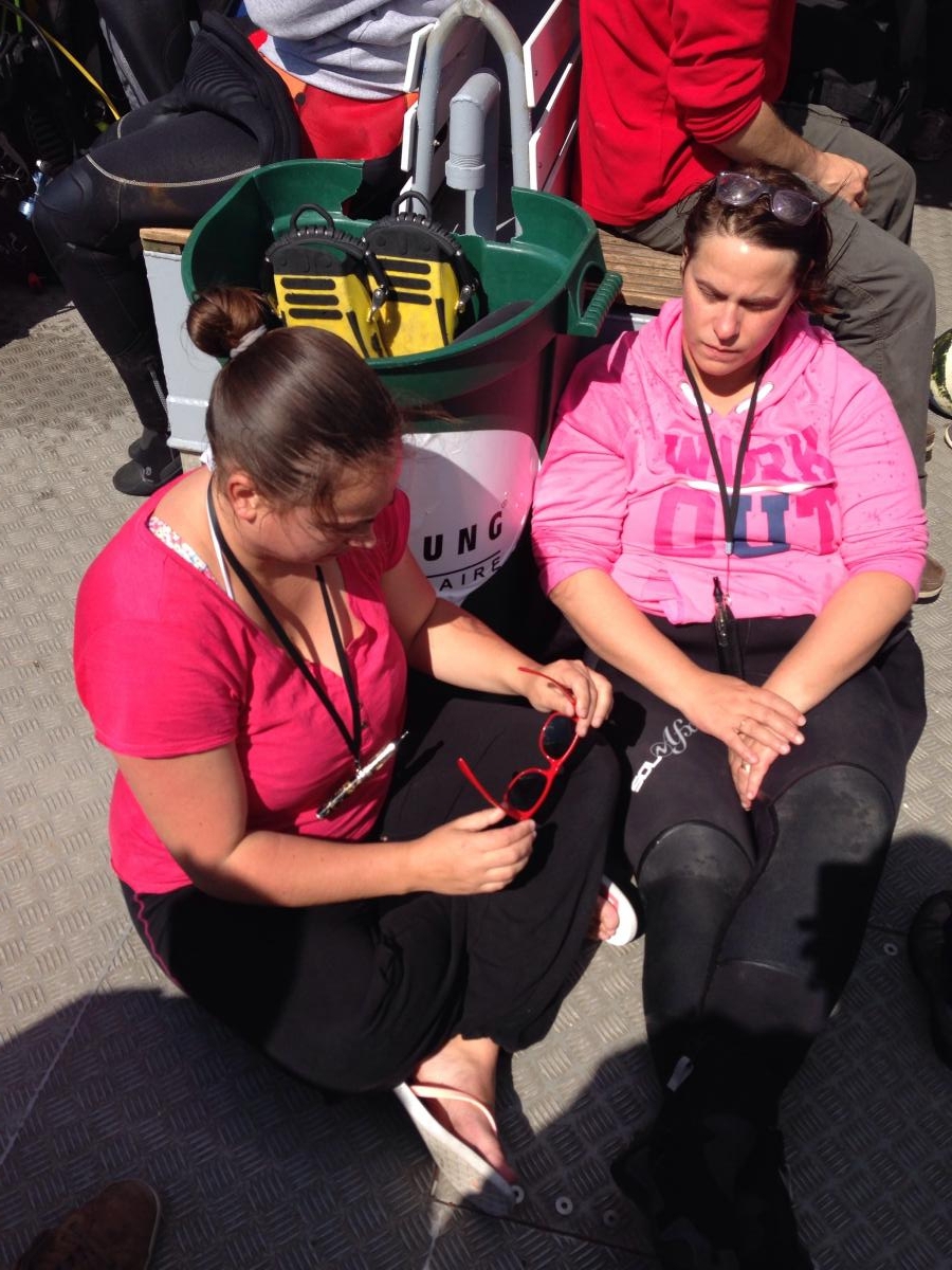 Antoine et Christelle (Sécu 2) remontent, on se met à l'eau. Il y a de gros creux (> 1 mètre), on ne s'attarde pas en surface.